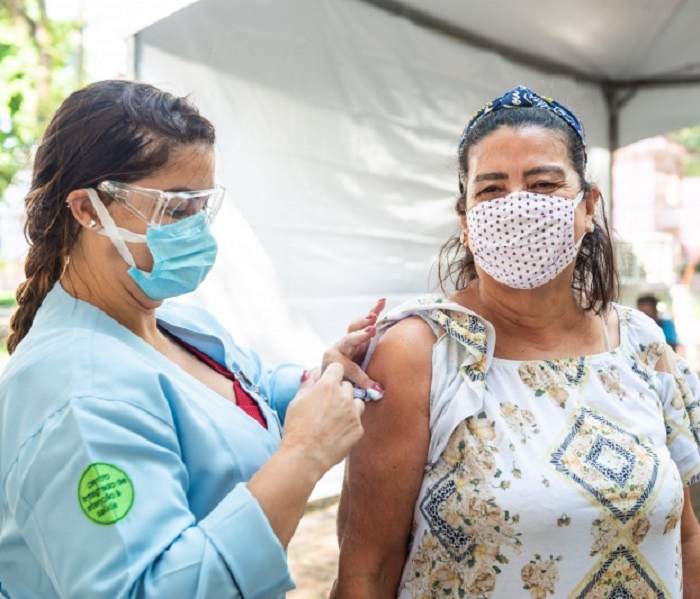 A artesã Vera Lúcia da Vitória recebendo a primeira dose da vacina, nesta sexta-feira (2).