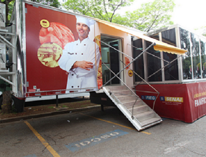 Oficinas acontecem dentro de uma carreta do Senai transformada em cozinha e sala de aula