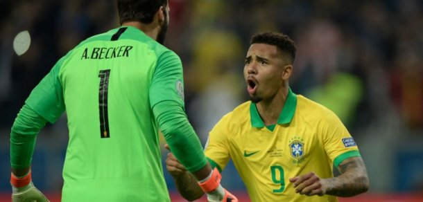 Alisson e Gabriel Jesus comemoram após a vitória dos Brasil nos pênaltis.