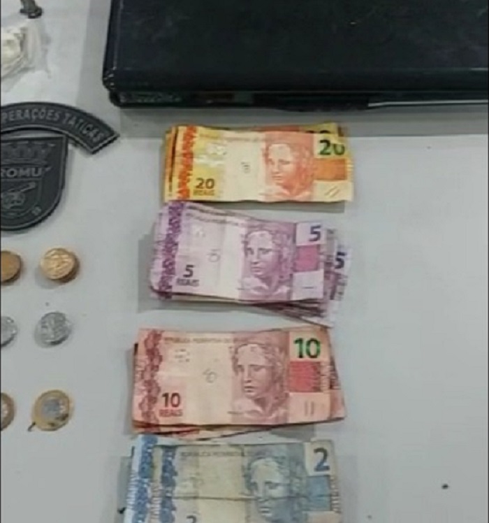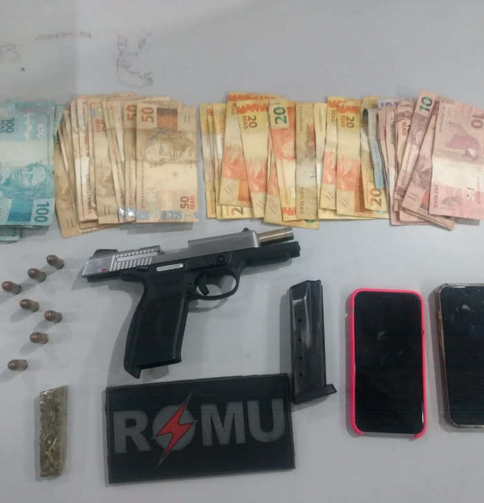 ROMU: suspeito preso com arma, munições, dinheiro e droga