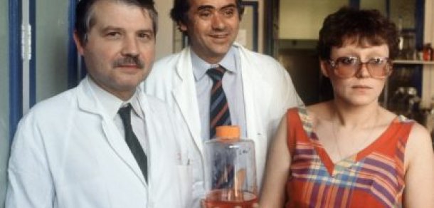 Professores Luc Montagnier, Jean-Claude Chermann e Françoise Barre-Sinoussi, em 1984.