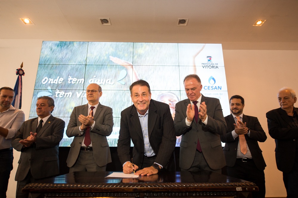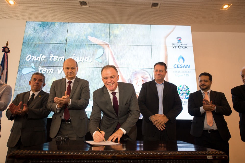 O Governo do Estado do Espírito Santo e o Município de Vitória assinaram, nesta quinta-feira (21), o contrato que permite à Companhia Espírito Santense de Saneamento (Cesan) continuar a prestação dos serviços de abastecimento de água, coleta e tratamento de esgoto na cidade pelos próximos 30 anos. Pelo acordo, a Cesan vai realizar os investimentos necessários para atender ao plano municipal de saneamento. Durante a solenidade realizada no Palácio Anchieta, foram assinados outros dois convênios para serviços de saneamento na Capital.
