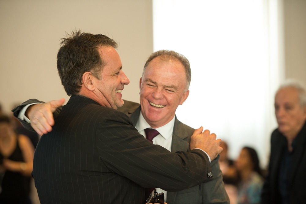 O governador do Espírito Santo, Renato Casagrande e o prefeito de Vitória, Luciano Rezende, comemoram a assinatura do convênio. Foto. Ademir Ribeiro - Secom/ES.