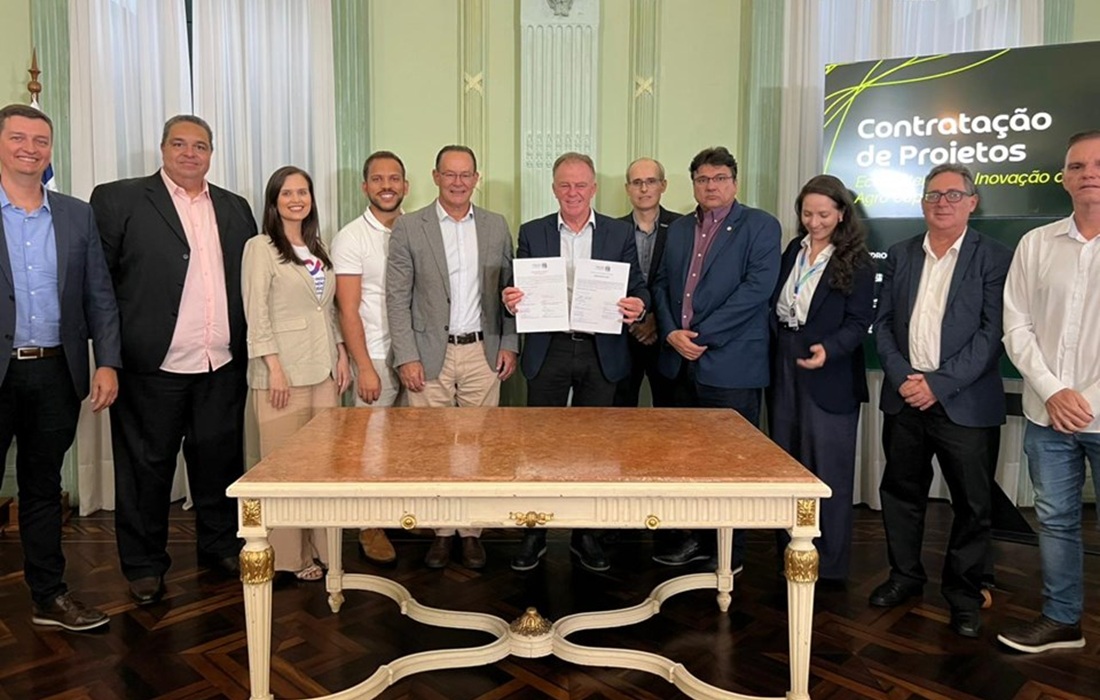 O Governo do Estado realizou, nesta quarta-feira (11), no Palácio Anchieta, em Vitória, a assinatura da contratação de dois projetos vinculados ao Programa de Estruturação do Ecossistema de Inovação do Agro Capixaba: Agroinventores e Rotas Rurais ES. Durante o evento, também foi anunciado o Projeto de Mapeamento, Monitoramento e Comunicação Estratégica para a Consolidação da Governança do Ecossistema de Inovação do Agro Capixaba.
