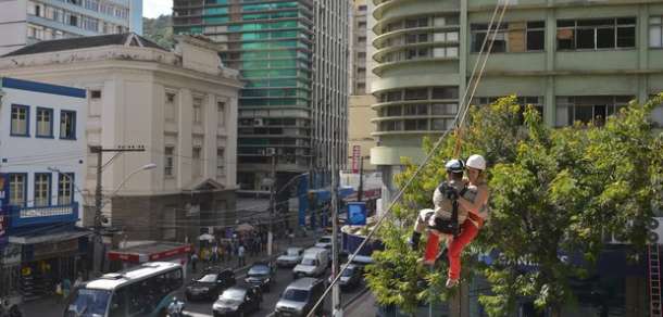 Simulação de resgate dos Bombeiros chama atenção no Centro de Vitória.