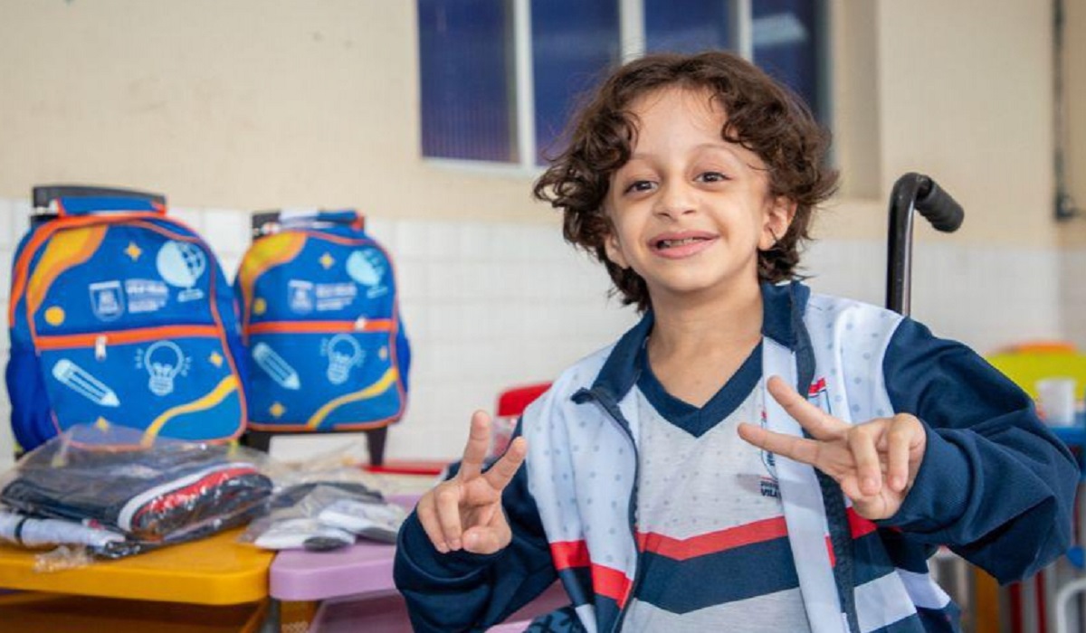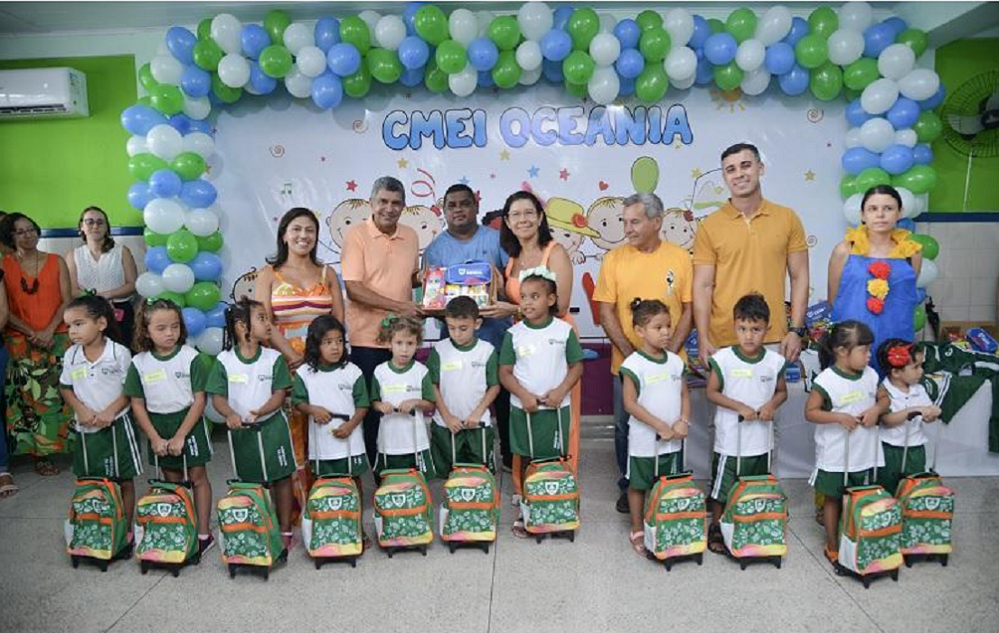 Crianças receberam o kit de material escolar e o conjunto de uniforme, além da mochila.