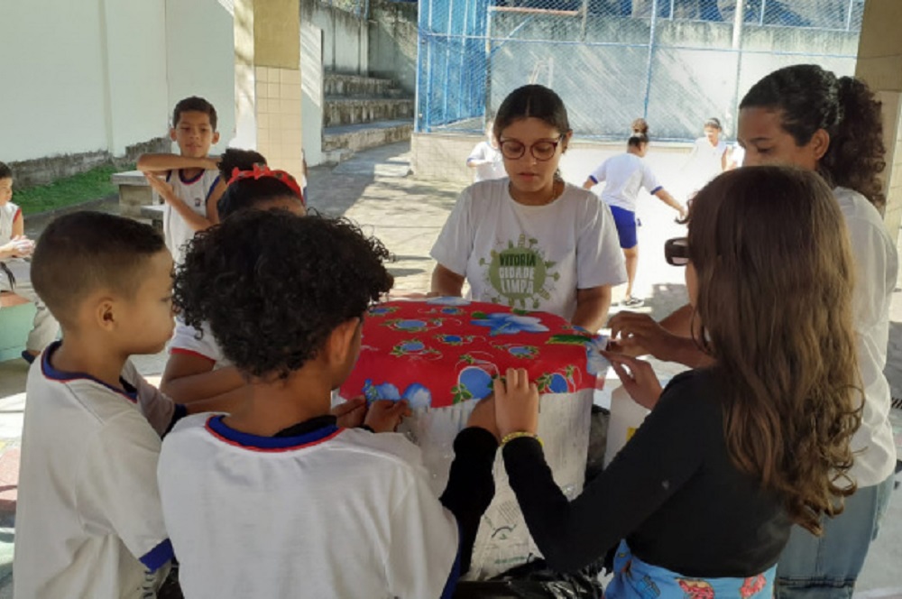Oficina de pufe ensina estudantes da escola em Vitória a reaproveitarem garrafas plásticas