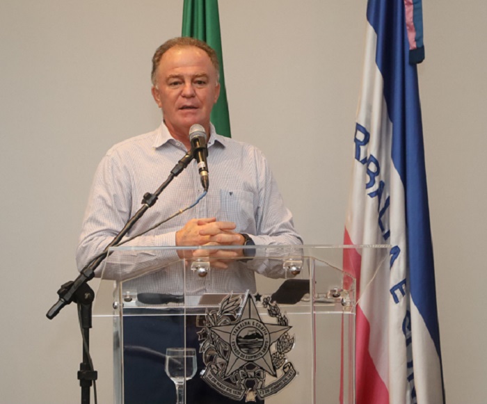 Evento com presença do governador Renato Casagrande dando as boas-vindas aos oficiais.