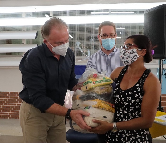 A ação marca o início da distribuição das cestas por conta da suspensão das aulas presenciais.