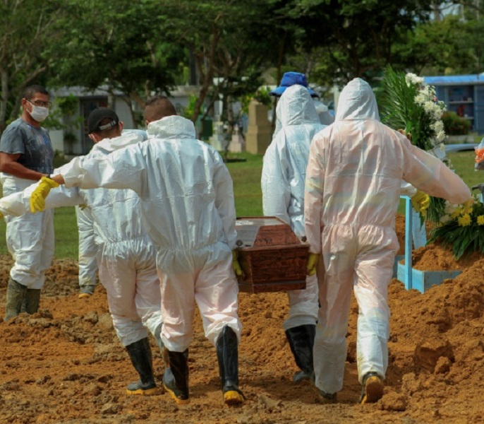 Coveiros carregam o caixão de vítima da covid-19 no cemitério de N. Sa Aparecida, Manaus.
