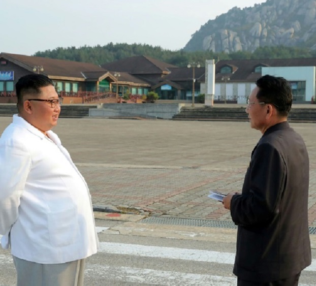 O líder norte-coreano Kim Jong Un (C) na área turística do Monte Kumgang, em 2019.